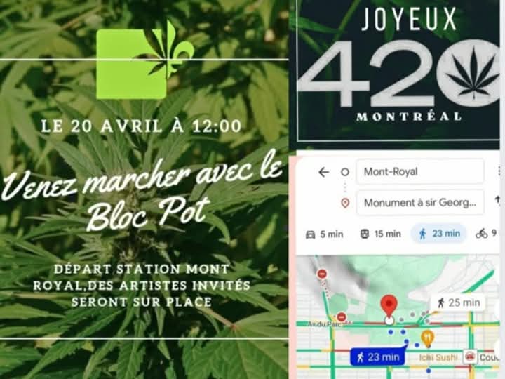 Hey tout le monde ! Le 4/20 arrive à grands pas et comme chaque année, on se retrouve au Mont-Royal pour célébrer ensemble avec le Bloc Pot ! C'est l'occasion parfaite de partager un moment convivial, de rencontrer des amis et de profiter de l'esprit communautaire. Venez nombreux pour cette belle journée de célébration ! On vous attend avec impatience !