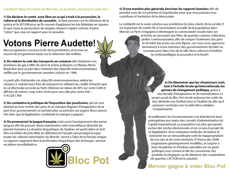 1) De déclarer le comté zone libre en ce qui a trait à la possession, la culture et la distribution du cannabis. Je ferai pression sur les Ministres de la justice et la SPCUM pour qu'ils cessent d'appliquer les lois fédérales en vigueur et que cesse la persécution de simples citoyens n'ayant commis d'autre "crime" que ceux en rapport avec le cannabis.