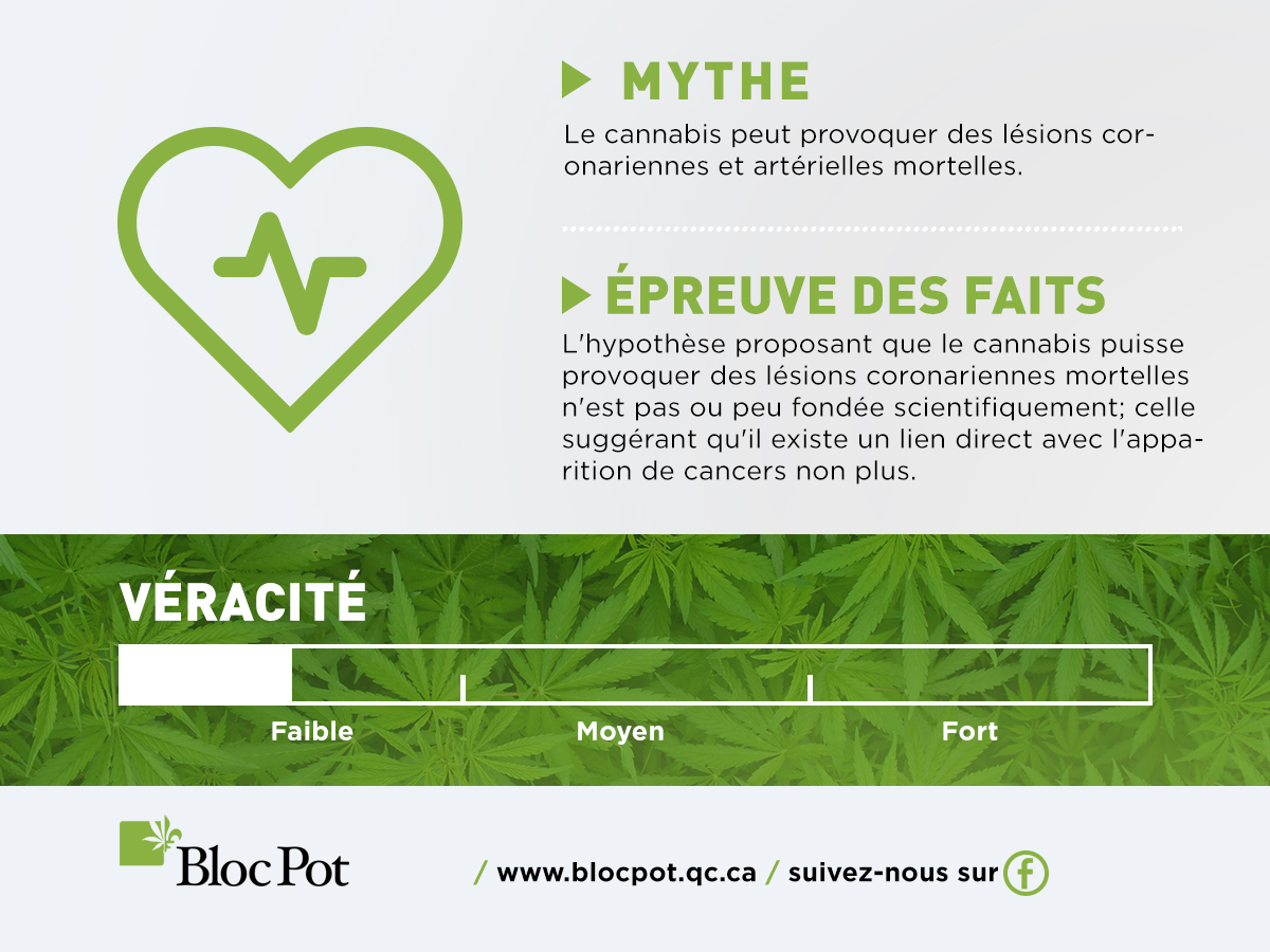 Il existe peu d’études sur l’impact de l’usage de cannabis sur le cœur et la fonction cardiovasculaire. Une synthèse récente a rapporté que les mécanismes qui sous-tendent les effets du cannabis sur le système cardiovasculaire sont « complexes et pas entièrement compris » (Volkow et autres, 2014). Même s’il a été conclu que l’usage de cannabis est associé à des effets aigus qui peuvent déclencher des événements comme des crises cardiaques ou des ACV (Jouanjus et autres, 2014; Thomas et autres, 2014), des liens évidents de cause à effet n’ont pas été établis. La recherche a aussi eu tendance à suggérer que les effets cardiovasculaires potentiellement risqués du cannabis fumé sont plus probables chez les adultes plus âgés (Hall, 2014). En somme, il faudra de la recherche continue sur ces effets sur la santé, mais les affirmations qui prétendent que des « dommages mortels » sont reliés au cannabis exagèrent les conclusions scientifiques.