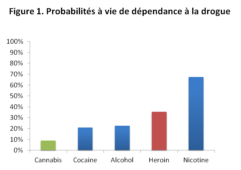 Lopez-Quintero et ses collègues ont examiné les données multiphases de l’enquête épidémiologique nationale américaine sur l’alcool et les conditions reliées, une enquête représentative auprès de personnes de 18 ans et plus (taille de l’échantillon : 7 389 utilisateurs de cannabis) (Lopez-Quintero et autres, 2011). Ces auteurs ont observé que la probabilité de dépendance après la première année d’usage était d’environ 2 % (c.-à-d. très faible) pour les utilisateurs de nicotine, d’alcool et de cannabis; pour les utilisateurs de cocaïne, cette probabilité était de 7,1 %. Après une décennie d’utilisation, les probabilités étaient plus élevées pour les utilisateurs de nicotine (15,6 %), de cocaïne (14,8 %) et d’alcool (11 %) comparativement aux consommateurs de cannabis (5,9 %). La probabilité à vie de développer une dépendance au cannabis a été estimée à 8,9 %, c’est-à-dire que moins de 9 % des utilisateurs à vie du cannabis rapportent une dépendance à la drogue. Cette probabilité de 9 % pour la dépendance au cannabis est la plus souvent citée, y compris plus récemment dans deux articles synthèses scientifiques importants sur l’impact du cannabis (Hall, 2014; Volkow et autres, 2014). Cela est beaucoup plus faible que les probabilités estimées de dépendance à vie des utilisateurs de nicotine (67,5 %), d’alcool (22,7 %) et de cocaïne (20,9 %) (Lopez-Quintero et autres, 2011). La probabilité à vie de développer une dépendance à l’héroïne a déjà été estimée à 23,1 % et 35,5 % (Anthony et autres, 1994).
