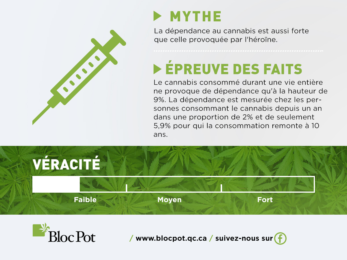 - Il n’existe aucune preuve scientifique permettant de suggérer que le cannabis a le même potentiel de causer une dépendance que l’héroïne. La recherche scientifique a constaté que moins de 1 personne sur 10 qui consomme du cannabis tout au long de sa vie en viendra à développer une dépendance au cannabis, ce qui signifie que plus de 90 % ne développent aucune dépendance (Anthony et autres, 1994). La probabilité à vie de développer une dépendance à l’héroïne, d’un autre côté, a été estimée à 23,1 % (Anthony et autres, 1994). Il est intéressant de noter que le potentiel d’accoutumance à vie du cannabis est également beaucoup plus faible que celui d’autres drogues légales et illégales, puisqu’on estime que 20,9 % des utilisateurs de cocaïne, 22,7 % des consommateurs d’alcool et 67,5 % des consommateurs de nicotine deviennent dépendants (Lopez-Quintero et autres, 2011).
