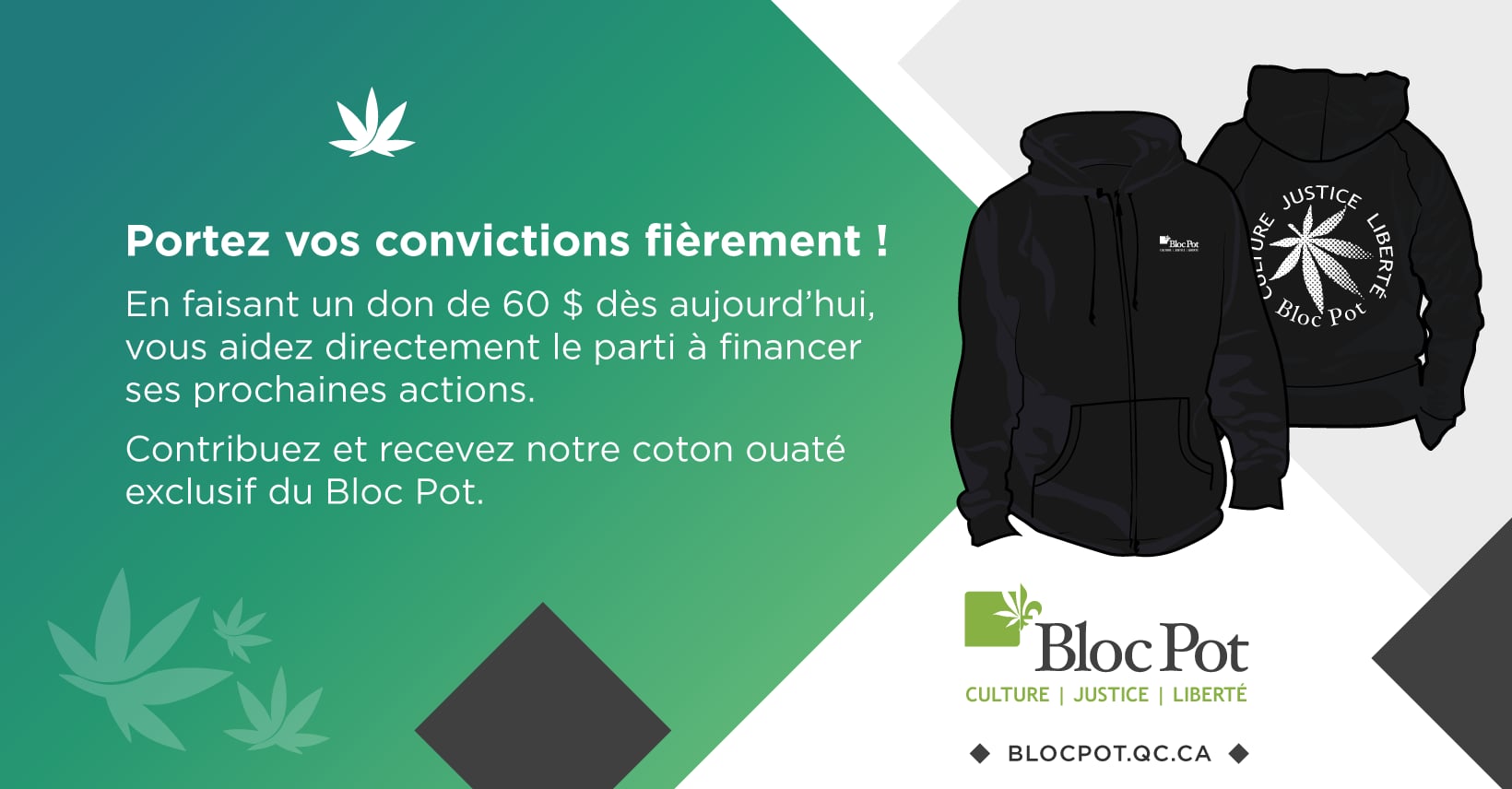 En faisant un don de 60$ dès aujourd'hui, vous aidez directement le parti à financer ses prochaines actions. Contribuez et recevez notre Coton outé exclusif du Bloc Pot.