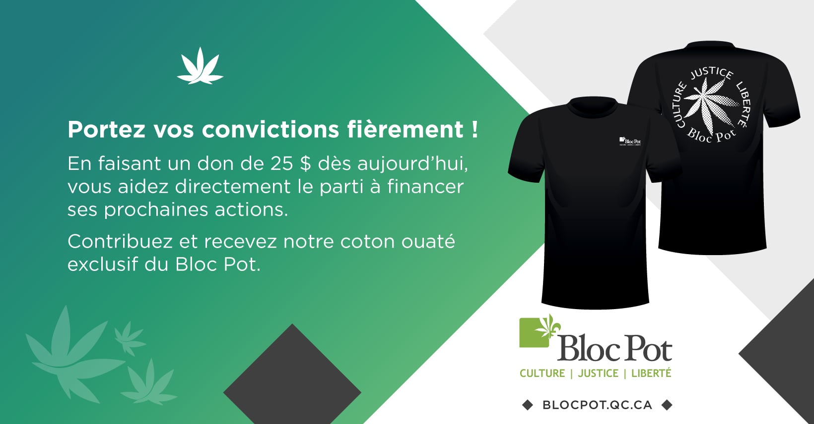 En faisant un don de 25$ dès aujourd'hui, vous aidez directement le parti à financer ses prochaines actions. Contribuez et recevez notre T-shirt exclusif du Bloc Pot.