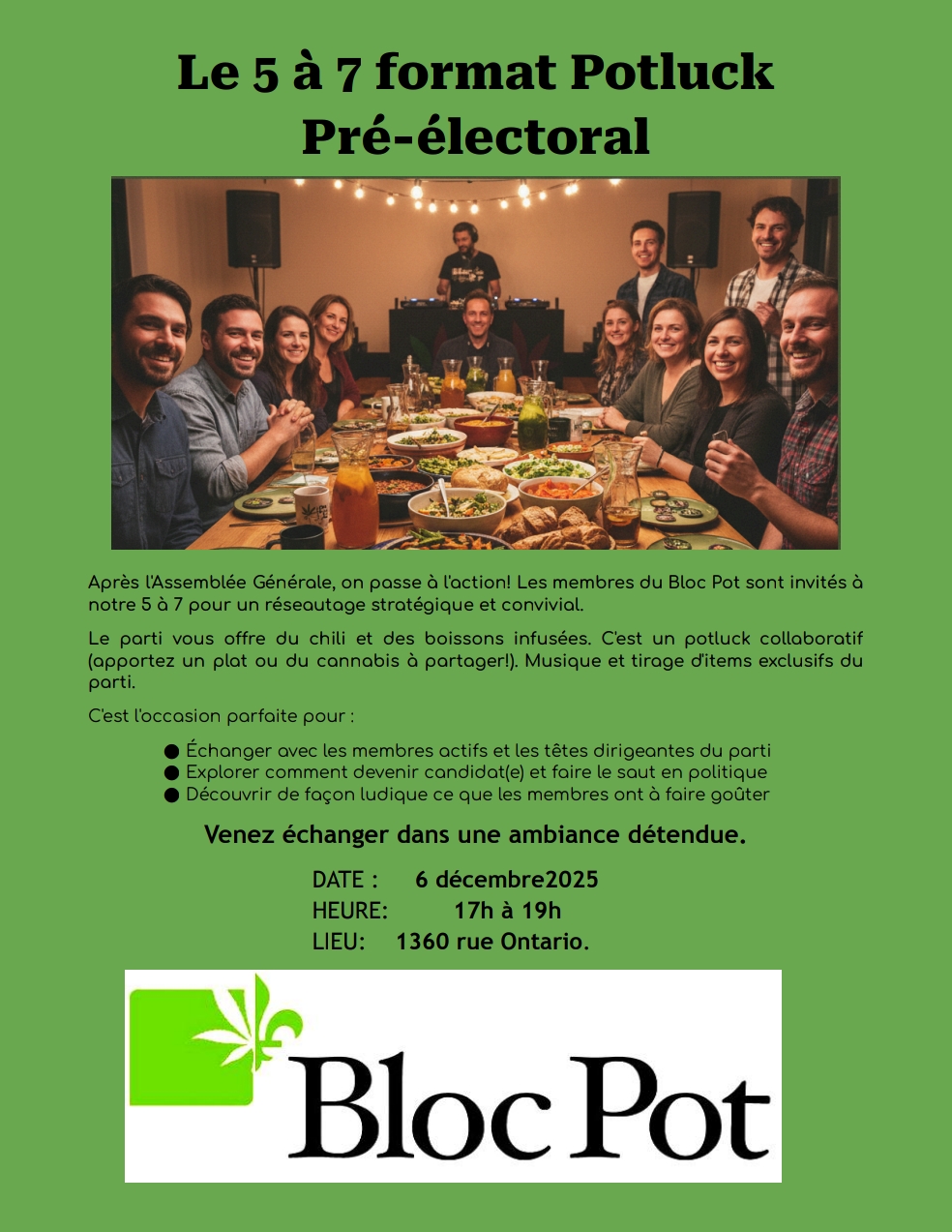 Après l'Assemblée Générale, on passe à l'action! Les membres du Bloc Pot sont invités à notre 5 à 7 pour un réseautage stratégique et convivial.