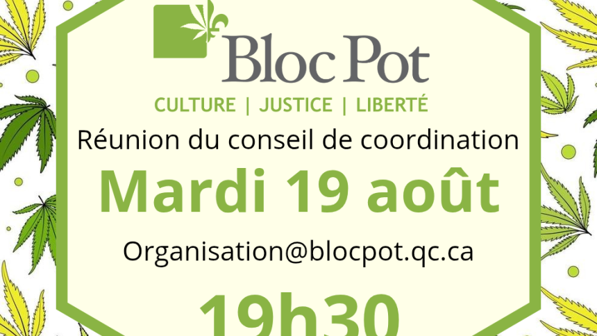 Chers(ères) membres du Bloc Pot, participez à la réunion du conseil de coordination mardi le 19 août 2025 à 19h30 en visioconférences. Écrivez nous à l’adresse suivante pour recevoir le lien web de la réunion : organisation@blocpot.qc.ca