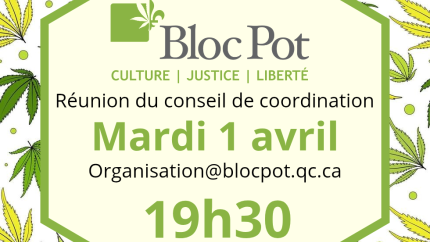 Cher(e)s membres du Bloc Pot, vous êtes convié(e)s à la réunion mensuelle du conseil de coordination du Bloc Pot mardi le 1er avril 2025. Pour recevoir le lien en visioconférence et l'ordre du jour, écrivez- nous à l'adresse courriel suivante : organisation@blocpot.qc.ca